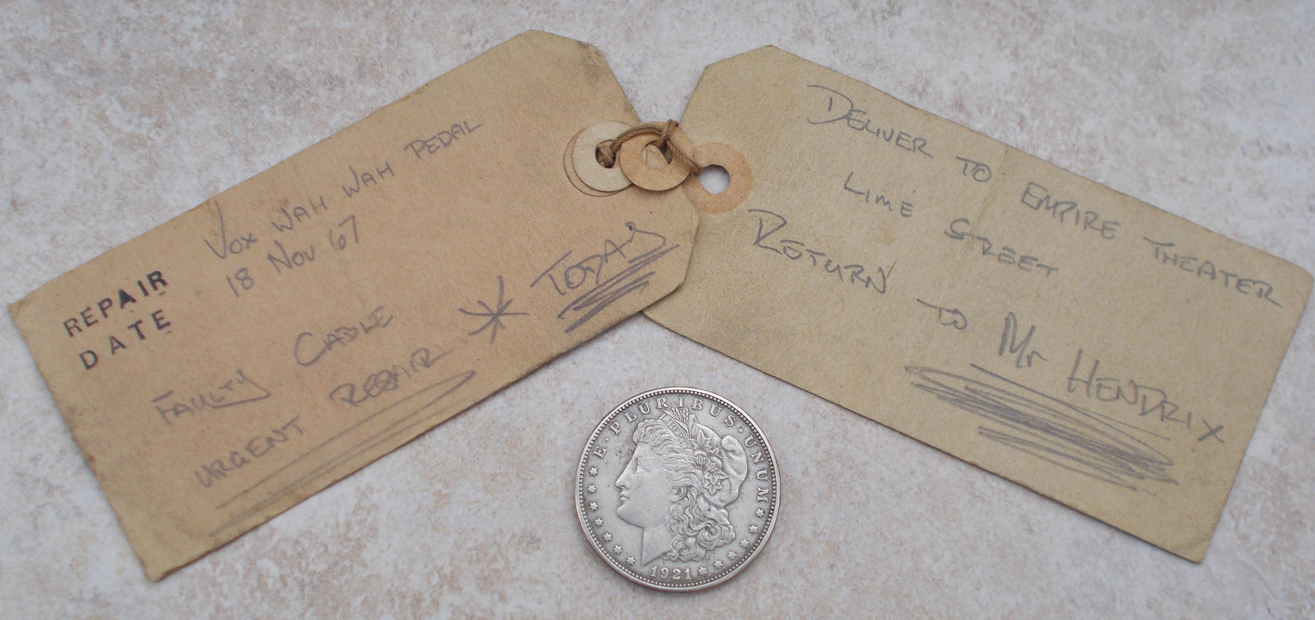 Hendrix Tag and Dollar: These repair tickets and dollar I kept after repairing a Guitar effects pedal for Jimi Hendrix when he was appearing at Liverpool’s Empire Theatre in 1967. Photograph: Ernie Sealey.