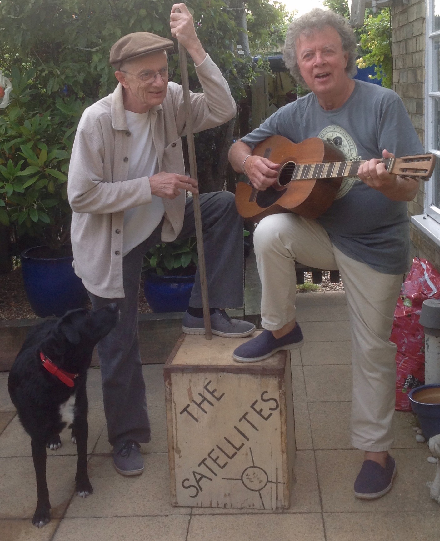 The Satellites Skiffle Group Reform 12th July 2015. Paul Griggs (Guys n’ Dolls) and Nigel Griggs (Split Enz) reunite as The Satellites recreating their first ever public performance on 4th January 1958. Holding the original instruments made by their Father by Paul Griggs.