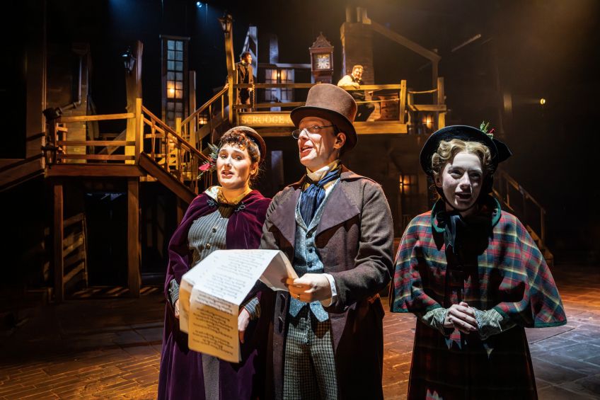 Ryan O’Donnell plays a creditable younger Ebenezer Scrooge, for whom love and romance are quickly subsumed by a lust for money, and he’s a credible, likeable Bob Cratchitt, too, again without exaggerating emotions, qualities and characteristics. It’s to be hoped, though, that Bob’s Christmas presents include a huge furnace of an oven and a time machine for his wife because otherwise that massively gigantic turkey will never get properly cooked in time for dinner and the Cratchitts will all die of salmonella poisoning. But never mind that, for now comes a fine, rousing chorus finale from the large and lively cast with lots and lots of applause, and all ends well – for now.