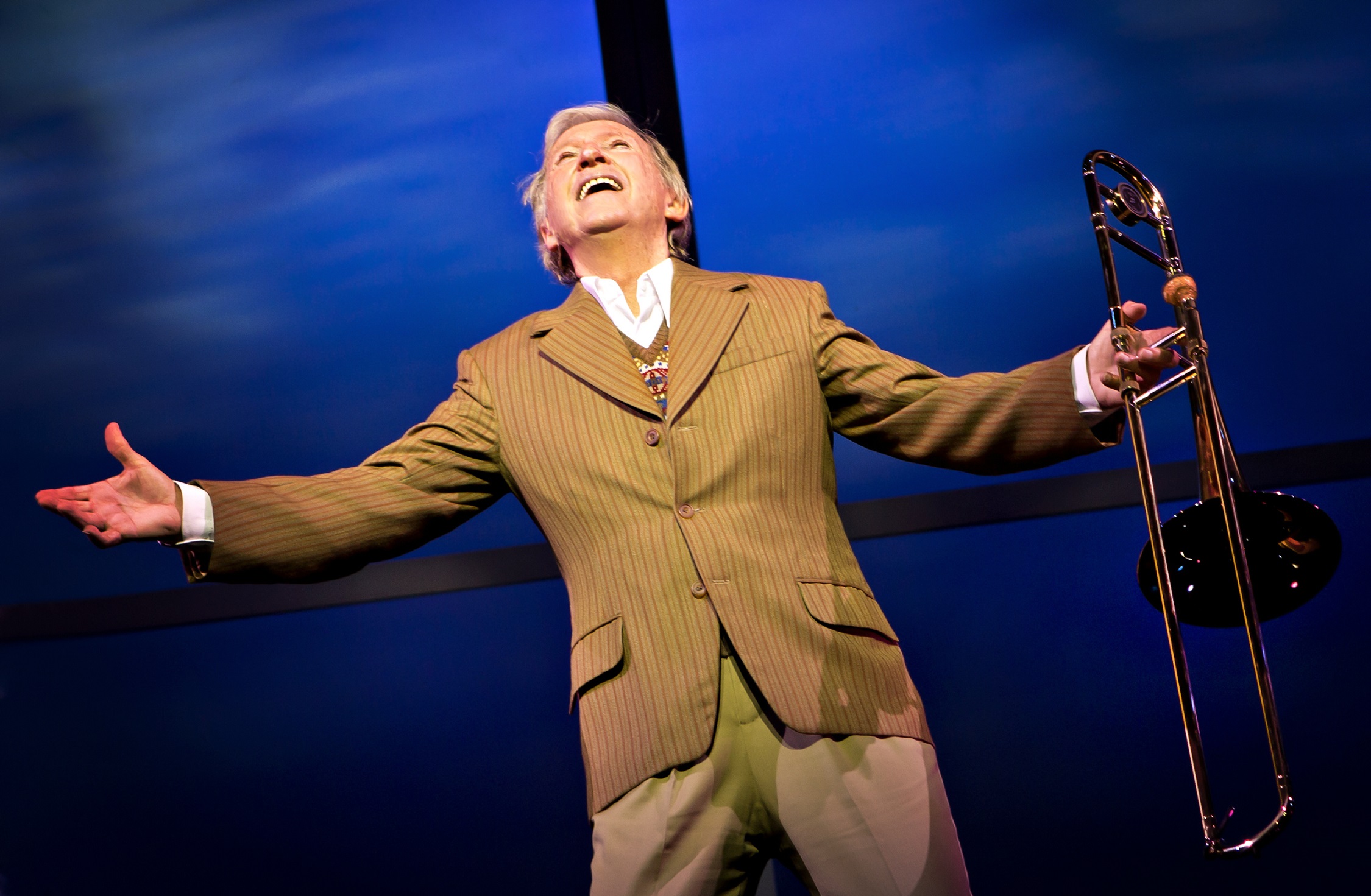 The dazzling smile, the familiar blink, boundless enthusiasm and oodles of charismatic sparkle – it’s Tommy Steele – still! Steele, teenage idol of the 1950s, will reach 80 by the end of the year but he’s as keen as ever to entertain. Glenn Miller, were he alive today, would be a little older at 112, though in life Miller didn’t reach even his fortieth birthday. Onstage, Tommy Steele plays young trombonist Miller in his twenties and thirties with added songs and (minimal) dance.