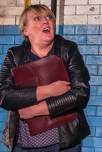 Beside a wall of tiles, cracked, chipped and badly stained, fixed with metal pipe and dull lights, sits a bank of grey, grimy lockers, a metal rail-bench below. A section of metal pithead frame lies overturned on the other side. Add the odd waft of steam, and Kevin Jenkins’ set evokes perfectly the time and place and gives versatile, flowing use of the studio space (especially that opening locker!) Pit helmets and coal-caked faces are not needed to bring vividly to life the lives of the everyday people in a mining village – just five superb actors dressed in everyday clothing (plus one in-your-face police sergeant’s uniform).