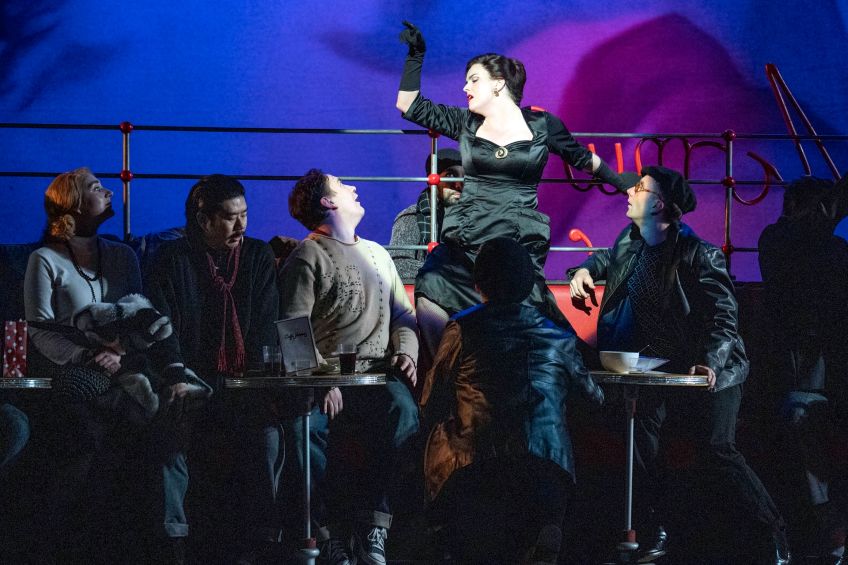 The love-at-first-sight scenario between Mimi and Rodolfo (or, since it takes place in the dark, love at first sigh) is hard to fully buy into and there’s no obvious chemistry between the pair, but in both her solos and his, and in their duets, there are highlight moments when voices soar with Puccini’s melody to delicious heights. In delicate song, broad-toned soprano Olivia Boen’s terminally ill Mimi tells us several times that everyone calls her Mimi even though her name is actually Lucia – but she doesn’t know why. Tragically, we never find out why, either. That a seamstress of that era is wearing trousers is a bit of an enigma, too. But that’s just by the by, for the ultimate, devastating tragedy of the piece is a supreme tear-jerker, the drama and heartbreak brilliantly evoked through Puccini’s magical mastery of music.