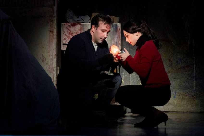 Reflecting the movie/photo/art theme, a white frame edges the stage, though this goes unnoticed once attention is fully focused inside it. The onstage garret, where the first and final scenes are set, perfectly evokes the stark, freezing, impoverished lifestyle of the penniless artist, poet, musician and philosopher, kept warm and alive in true romantic, bohemian vein, only through their love and devotion to the arts. The tall, grimy, grey walls are daubed with paint while filthy, tattered chairs, sink and cupboards litter the place, along with a severed mannequin and other grot. There’s no money for the electricity meter and no fuel for the monstrously huge stove other than the paltry pages of Rodolfo’s manuscript, which bring but a fleeting cosy glow. An impossibly shiny, pristine motor-cycle sits there, too, which would surely fetch a small French fortune at the pawnbroker’s, and by the end it has, indeed, been down-graded to a push-bike; yet still the men have scarcely two centimes to rub together.
