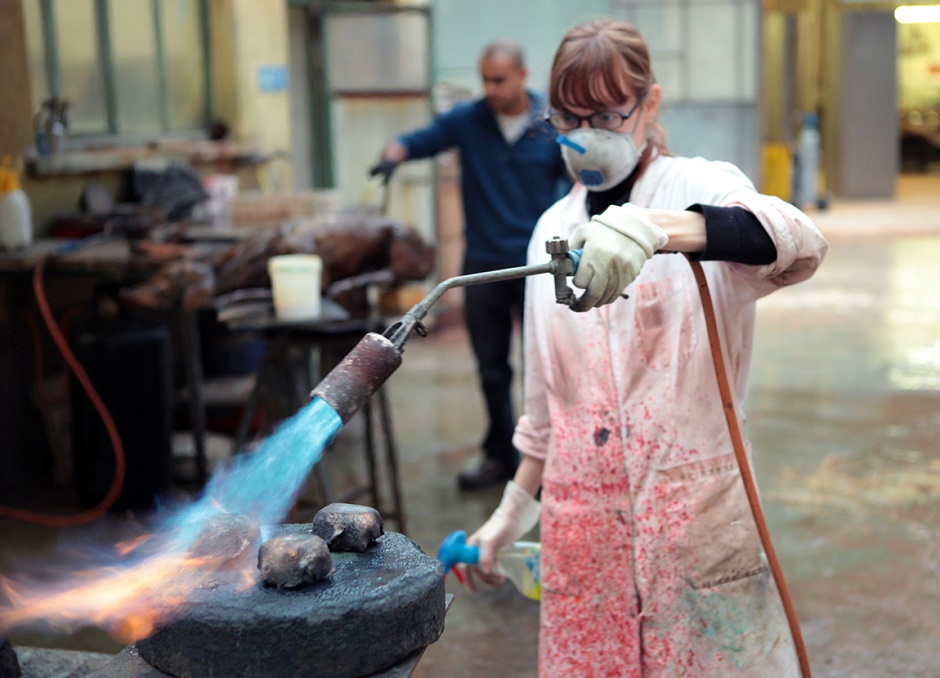 We see the moulds being mixed but never learn what materials are being used or why.  In any event, the cylindrical shaped mummy is subjected to a fiery kiln and, eventually, the mould is hacked open like a piñata at a Mexican birthday party, revealing the bronze dog, minus the legs that have to be welded back on. The sculpture still has to undergo a series of brushing and cleaning processes, none of which is explained.