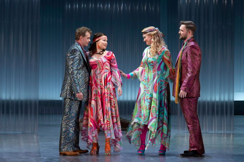 In fact, every voice delivers generous pleasure, whether alone, or in harmonising or overlapping combinations, as with the four Athenian lovers, Helena (Camilla Harris), Lysander (Peter Kirk), Hermia (Sian Griffiths) and Demetrius (James Newby), whose acting skills and commitment to character, like those of all the cast, are totally engaging. The 1960’s Flower Power costumes, chosen by Ashley Martin-Davis, fit perfectly with the dreamy, floaty ethereal music, the lasses in bright swirls of floaty frocks, headbands and platform shoes (or in petticoats) and the lads in patterned suits (or in pants and vests).