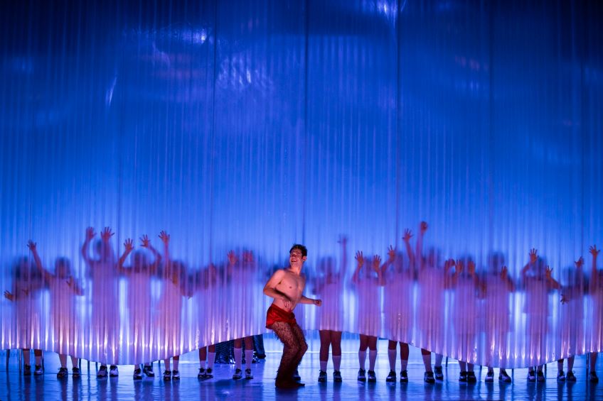 So, we might bathe our souls completely in the non-stop musical treasures and pleasures of the work, Johan Engels’ minimalist set offers little distraction as it conjures up perfectly this airy-fairy realm – which just happens to resemble some early, unearthly Star Trek planet, where Dr McCoy says, “It’s life, Jim, but not as we know it.” Simple curtains and strips of corrugated, transparent Perspex that drop or rise are the main element, one of which is used for the little orphan Indian boy/mannequin to beam down (and up) in turban and beads. Meanwhile a wondrous string of translucent, oblong balloons bob airily light and beautiful overhead, glimmering like spawn buoyed on water. Coloured lights delicately and beautifully infuse these areas as required with electric blue, auroras of green, pink and red or sunset yellows. All very soothing. Fairy-world props are scarce with just the occasional transparent lounger or silver, inflatable cushion raft turning up in the forest.