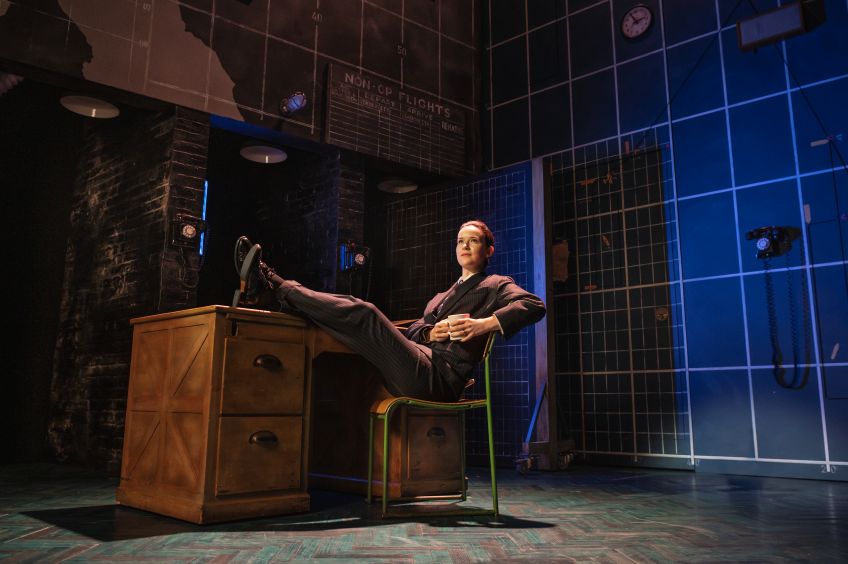 A fine, song-and-dance-free film of the operation was made in 1956 in The Man Who Never Was, all in black, white and shades of grey. This musical version, written by its original four performers, grew up through the pandemic era to accelerate skywards into a colossal, award-winning West End/Broadway phenomenon. Now it’s touring the world. A 1940’s black/white greyness is retained onstage in Ben Stones’ set, a section of soot-blackened, pock-marked London brick wall standing to the side of MI5’s tall, tall office walls of squared, black and white grids and blackboards. Here hang clipboards, a clock set forever at 11.00 o’clock (the end of WWI), and big black phones with long, curly cords just waiting to get their wires crossed. But don’t be fooled by all that drab grey and the plainness of MI5’s wooden desks! At any moment, shimmering, dancing neon lights and breathtaking, colour-drenched, decibel-laden light-shows may burst forth to stun with glitz and glitter, and even a humble blackboard may hide surprises. And the finale? Well, think BIG.