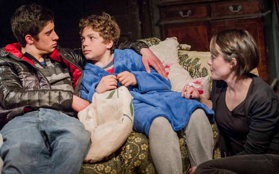 Lt-Rt: James Musgrave (Petya), Albie Marber (Kolya) and Lisa Diveney (Sasha), Donkey Heart by Moses Raine, Directed by Nina Raine, 7th-31st January 2015, Trafalgar Studios, 14 Whitehall, London, SW1A 2DY, Box office: 0844 871 7632, atgtickets.com