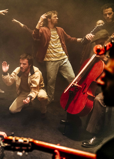 Dead bodies are swung like a pendulum to a familiar waltz tune played live by the band down stage. Soap bubbles drop from the flies.