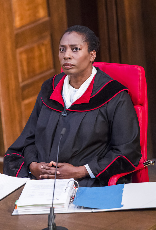 In Holmes’s production the judge is female and black. The Counsels for Prosecution and Defence and the two witnesses are white. The person on trial, an air force pilot, is black. But the cast could be any sex and any colour.