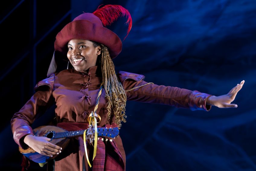 All-round eclectic, the piece ranges from a pedestrian simplicity of words as at a school play to brightly sparkling, opera-house purple patches. Injecting animated fun into a character both serious and comical is professional singer Pasquale Orchard as Christina, her protracted, opera-spoof death bringing laughter as she “arias” heartily from her death-bed – several times – before expiring, only to revive and skip off, bursting with health. Ross Ramgobin sings the tyrannical Count, dark and severe in Romanesque helmet and armour. His mock maniacal laugh makes the villain less seriously scary, though, which is, perhaps, a shame. Intense horror is not the predominant vibe of The Green Man, either, Daniel Wright gaining valuable experience as he takes on this prominent, green-clad role, accompanied by three, song-enhancing, gauzy-clad shadows, as well as also playing the hymn-singing priest. Akele Obiang as Christina’s cousin Caspa/Casper is a wonderfully jolly, charming presence in the vein of a carefree, lute-toting, strolling minstrel – or a Blue Peter presenter – full of wit and radiance.
