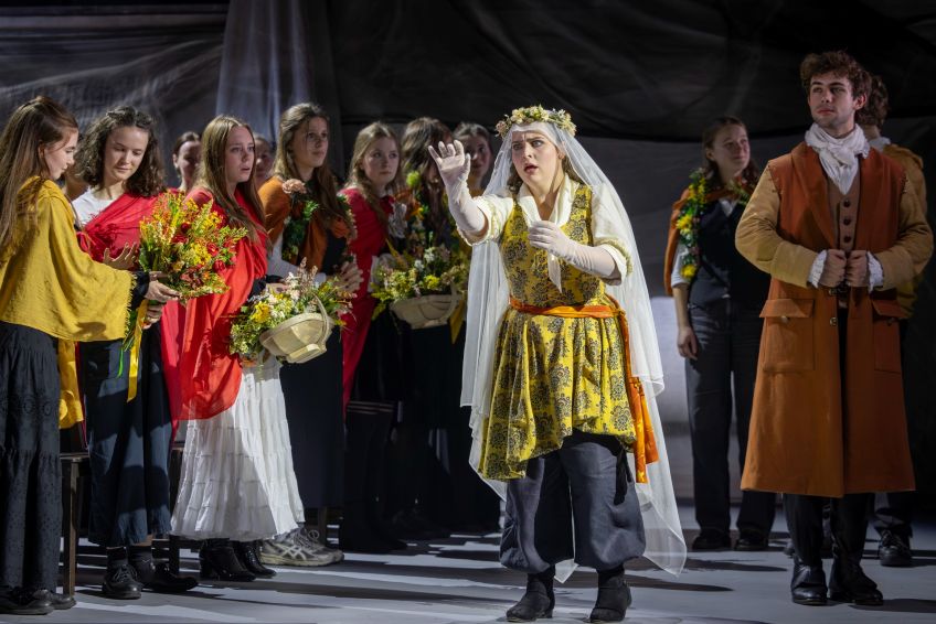 Fine set, costumes and lighting together fittingly evoke grey, Gothic, cloudy, misty gloom on two levels as cobwebby garments and gauzy mountain peaks conjure up a suitable atmosphere for the dark tale – or rather, for the two dark tales, since two different stories are linked here, alternating back and forth, in time-travel fashion, between Poland in the 1400s and in the 1970s. Each of the stories has a chilly horror, but melodrama, farce and comedy sit firmly at the forefront.