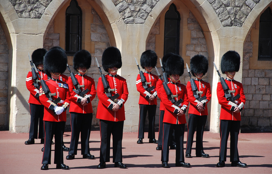 The privilege of guarding the Sovereign traditionally belongs to the Household Troops, better known as ‘The Queen’s Guard’ (or The King’s Guard if the reigning monarch is male), who have carried out this duty since 1660. For operational and other reasons, this privilege is periodically extended to other regiments of the British Army. The Guards consist of five infantry regiments – the Grenadier, Coldstream, Scots, Irish and Welsh Guards – and two regiments of the Household Cavalry – the Life Guards and Blues and Royals. Most of the Guards will have seen action overseas and all are fully operational soldiers.